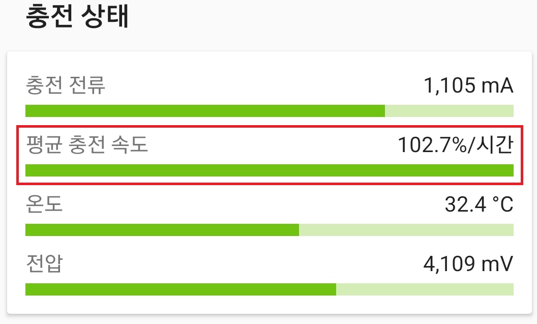 유선충전의 충전량은 시간당 약 100~110%.. 고속 충전 맞는듯.